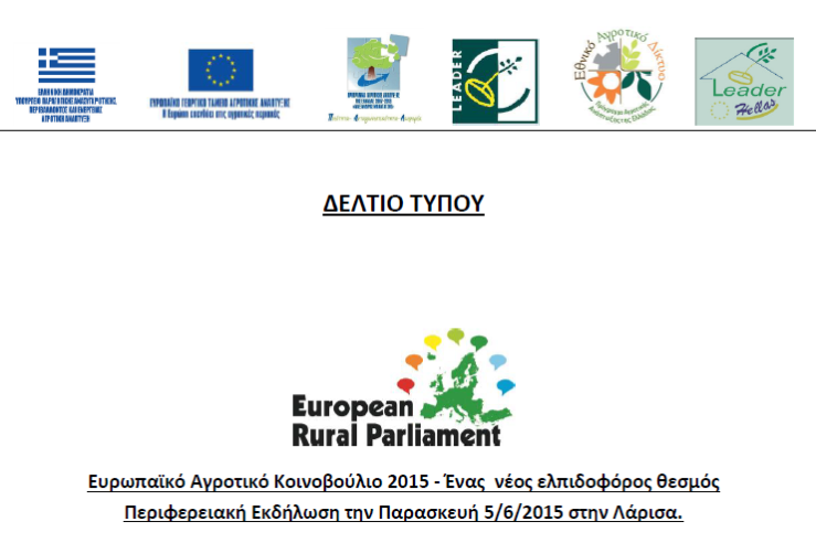 Το Εθνικό Αγροτικό Δίκτυο διοργανώνει Συνάντηση Εργασίας, στο πλαίσιο της Εθνικής Καμπάνιας για το Ευρωπαϊκό Αγροτικό Κοινοβούλιο 2015, η οποία θα πραγματοποιηθεί την Παρασκευή 5 Ιουνίου 2015 στη Λάρισα, στο ξενοδοχείο «ΔΙΟΝΥΣΟΣ».