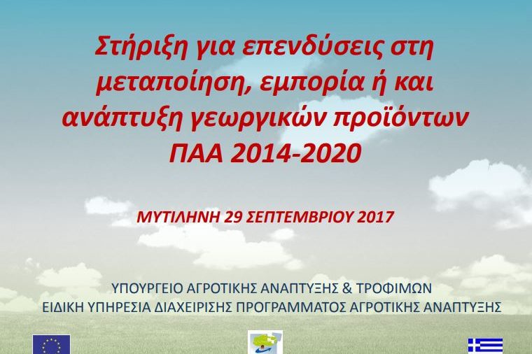Παρακάτω μπορείτε να δείτε τις παρουσιάσεις που έλαβαν χώρα στην Μυτιλήνη στις 29 Σεπτεμβρίου 2017 κατά την διάρκεια της ενημερωτικής ημερίδας «Χρηματοδοτικές δυνατότητες και ευκαιρίες για τα νησιά του Βορείου Αιγαίου». ΣΤΗΡΙΞΗ ΓΙΑ ΕΠΕΝΔΥΣΕΙΣ ΣΕ ΓΕΩΡΓΙΚΕΣ ΕΚΜΕΤΑΛΛΕΥΣΕΙΣ ΤΟΥ ΠΡΩΤΟΓΕΝΟΥΣ ΤΟΜΕΑ Ν. ΜΑΝΕΤΑΣ ΕΥΔ ΠΑΑ Η ΑΝΑΠΤΥΞΗ ΤΩΝ ΣΥΝΕΡΓΑΣΙΩΝ ΣΤΑ ΜΕΤΡΑ ΤΟΥ ΠΑΑ 2014 – 2020 Μ.…
