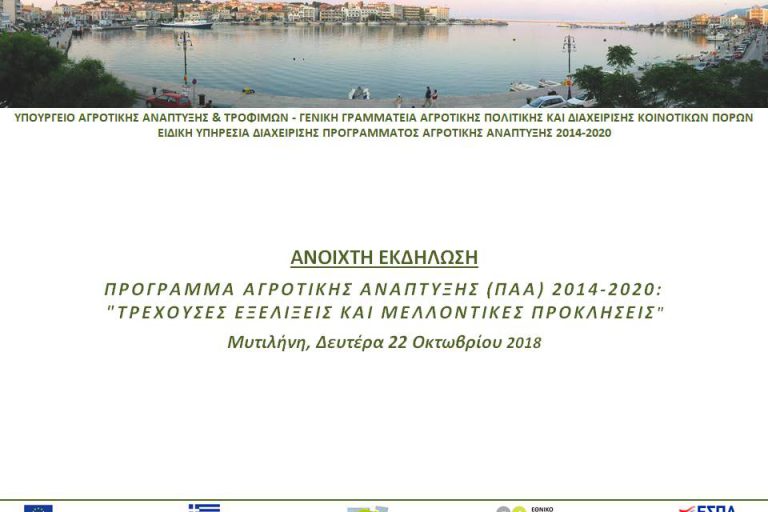 Η Ειδική Υπηρεσία Διαχείρισης ΠΑΑ 2014-2020 σε συνεργασία με την Περιφέρεια Βορείου Αιγαίου συνδιοργανώνουν ενημερωτική ημερίδα με θέμα «ΠΡΟΓΡΑΜΜΑ ΑΓΡΟΤΙΚΗΣ ΑΝΑΠΤΥΞΗΣ 2014-2020: Χρηματοδοτικές δυνατότητες και ευκαιρίες για τα Νησιά του Βορείου Αιγαίου», που θα πραγματοποιηθεί την Παρασκευή 29 Σεπτεμβρίου 2017, ώρα 18:30-21:30, στο Επιμελητήριο Λέσβου, αίθουσα συνεδρίων «Ι.Παυλακέλλης». Την έναρξη των εργασιών της ενημερωτικής ημερίδας…