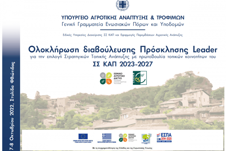Στο πλαίσιο λειτουργίας του Εθνικού Αγροτικού Δικτύου, η Γενική Γραμματεία Ενωσιακών Πόρων και Υποδομών του Υπουργείου Αγροτικής Ανάπτυξης και Τροφίμων διοργανώνει Εκδήλωση με θέμα: «Ολοκλήρωση διαβούλευσης Πρόσκλησης Leader για την επιλογή Στρατηγικών Τοπικής Ανάπτυξης με πρωτοβουλία τοπικών κοινοτήτων του ΣΣ ΚΑΠ 2023-2027» που θα πραγματοποιηθεί στις 7-8 Οκτωβρίου 2022 στο «Κτίριο του Ο.Σ.Κ.» στη Στυλίδα…