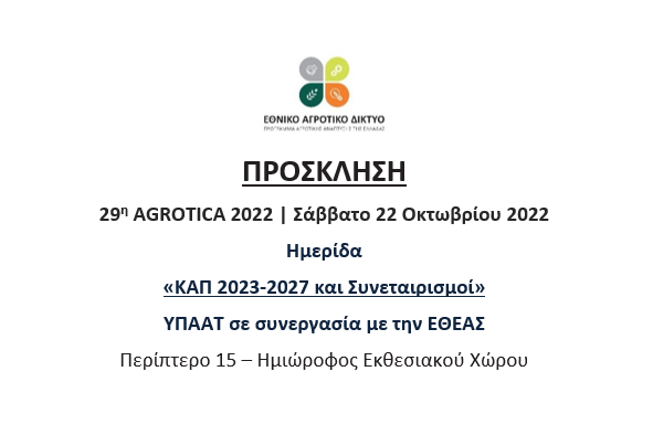 Ημερίδα «ΚΑΠ 2023-2027 και Συνεταιρισμοί» – 29η Agrotica – 22.10.2022 Εκδηλώσεις, Ενημερωτική ημερίδα Details