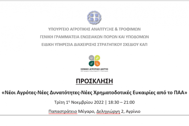 Εκδήλωση «Νέοι Αγρότες-Νέες Δυνατότητες-Νέες Χρηματοδοτικές Ευκαιρίες από το ΠΑΑ» 1η Νοεμβρίου 2022 Εκδηλώσεις, Ενημερωτική ημερίδα Details