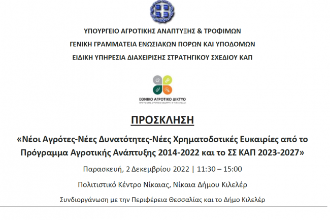 Εκδήλωση “Νέοι Αγρότες-Νέες Δυνατότητες-Νέες Χρηματοδοτικές Ευκαιρίες από το ΠΑΑ 2014-2022 και το ΣΣ ΚΑΠ 2023-2027” 2 Δεκεμβρίου 2022 – Νίκαια Δ. Κιλελέρ Εκδηλώσεις, Ενημερωτική ημερίδα Details