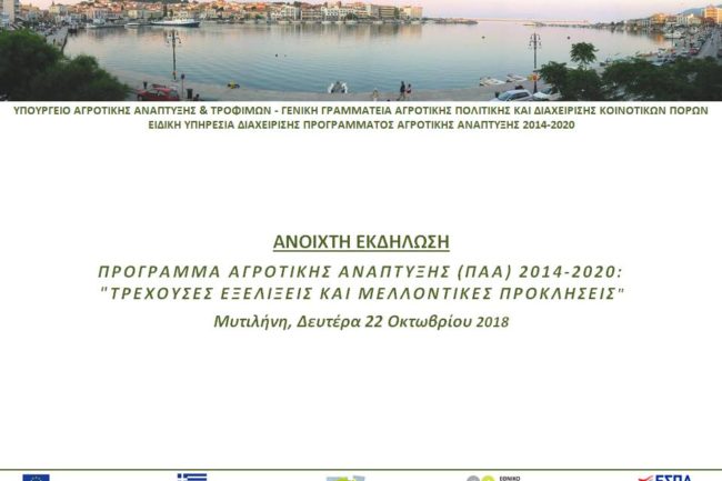 Οκτ252018 Μυτιλήνη 22/10/2018 – Ανοιχτή Εκδήλωση με θέμα «Πρόγραμμα Αγροτικής Ανάπτυξης (ΠΑΑ) 2014-2020: τρέχουσες εξελίξεις και μελλοντικές προκλήσεις» Κοινή Αγροτική Πολιτική, Νέα, ΠΑΑ Details