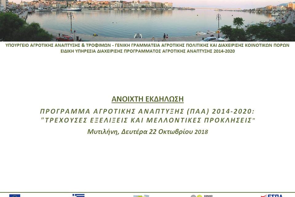 H Ειδική Υπηρεσία Διαχείρισης του Προγράμματος Αγροτικής Ανάπτυξης 2014-2020 (ΕΥΔ ΠΑΑ) διοργάνωσε ανοιχτή εκδήλωση με θέμα «Πρόγραμμα Αγροτικής Ανάπτυξης (ΠΑΑ) 2014-2020: τρέχουσες εξελίξεις και μελλοντικές προκλήσεις» η οποία πραγματοποιήθηκε στη Μυτιλήνη, τη Δευτέρα 22 Οκτωβρίου 2018, στην αίθουσα συνεδρίων «Ι.Παυλακέλλης» στο Επιμελητήριο Λέσβου, με τη συμβολή της Εταιρείας Τοπικής Ανάπτυξης Λέσβου Α.Ε. – ΕΤΑΛ Α.Ε..