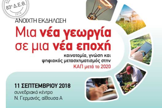 Η Ειδική Υπηρεσία Διαχείρισης του Προγράμματος Αγροτικής Ανάπτυξης σε συνεργασία με τη Διεύθυνση Αγροτικής Πολιτικής, Τεκμηρίωσης και Διεθνών Σχέσεων διοργανώνουν ανοιχτή εκδήλωση με τίτλο «Μια νέα γεωργία σε μια νέα εποχή: καινοτομία, γνώση και ψηφιακός μετασχηματισμός στην ΚΑΠ μετά το 2020» στο πλαίσιο της 83ης Διεθνούς Έκθεσης Θεσσαλονίκης.